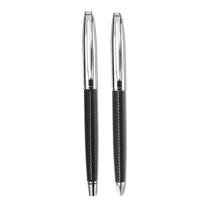 Metall-Kugelschreiber und Rollerball. Verpackt in PU-Etui. Kugelschreiber mit blauer Tinte und Rollerball mit schwarzer Tinte. Weiße Kontrastnähte.