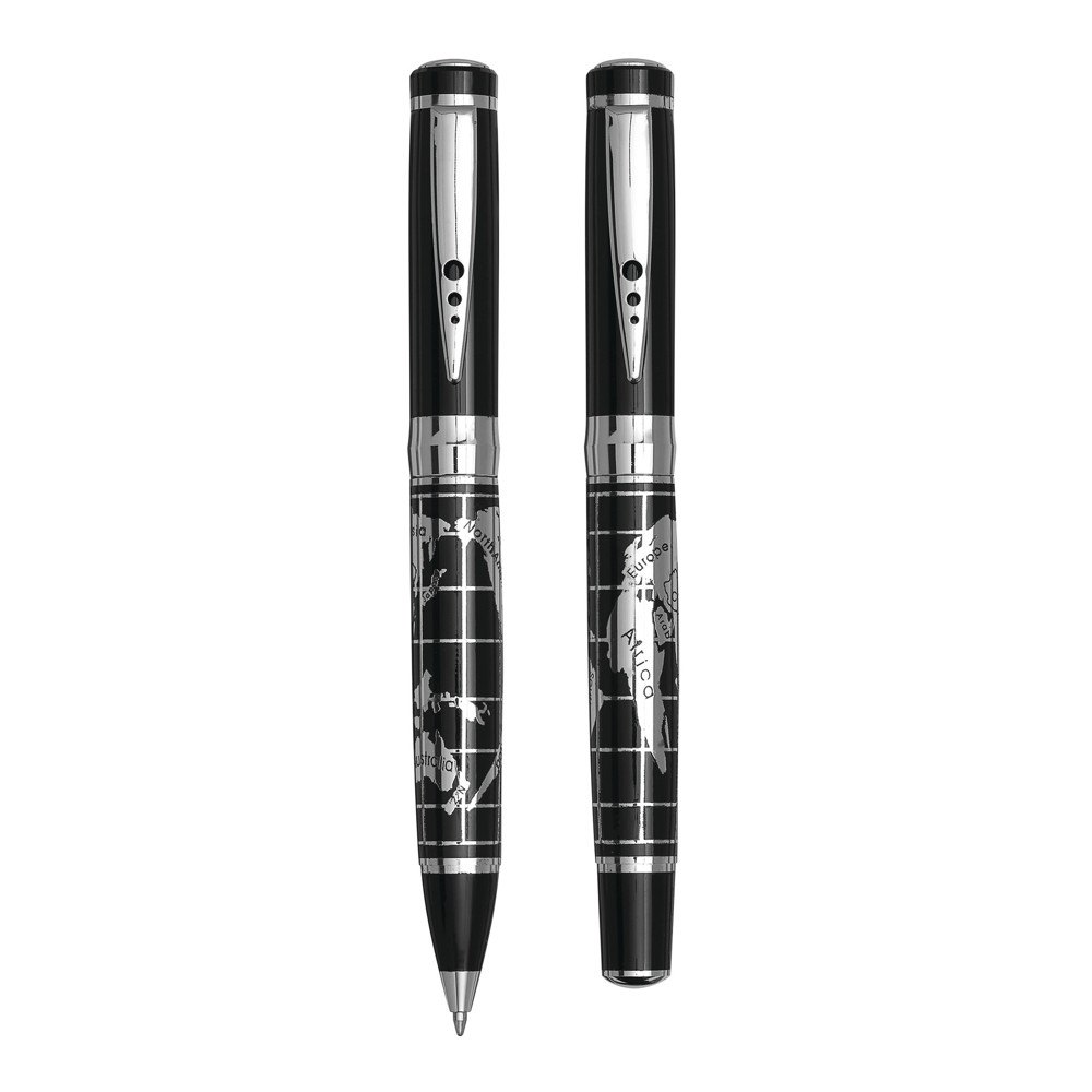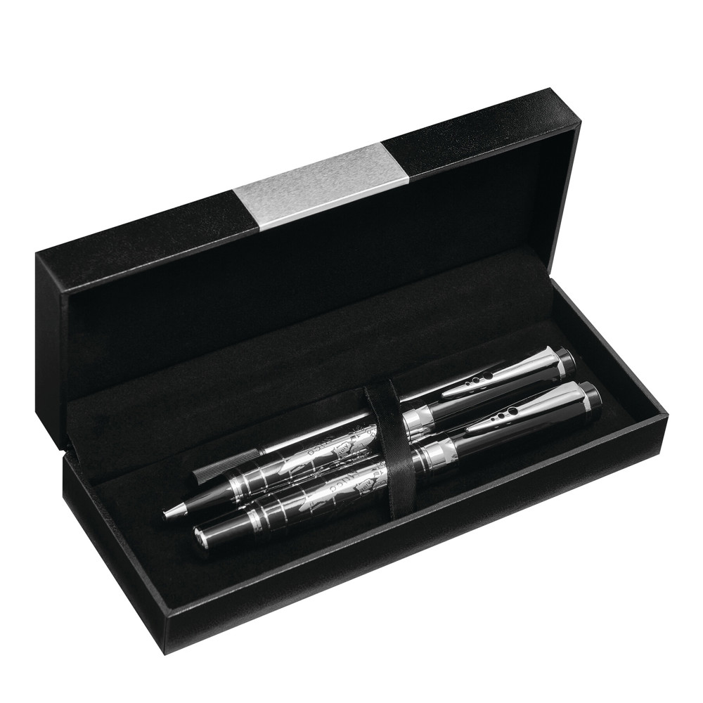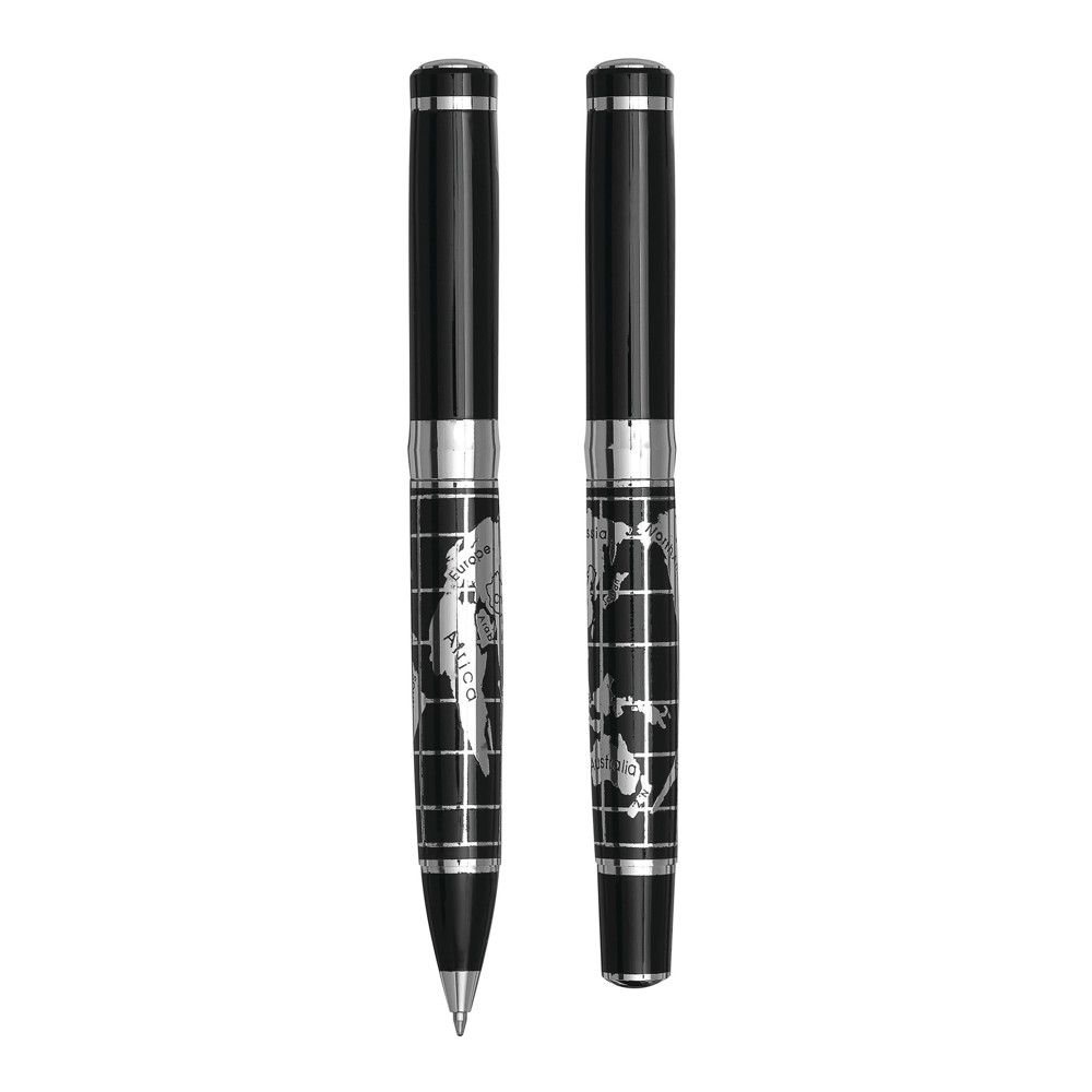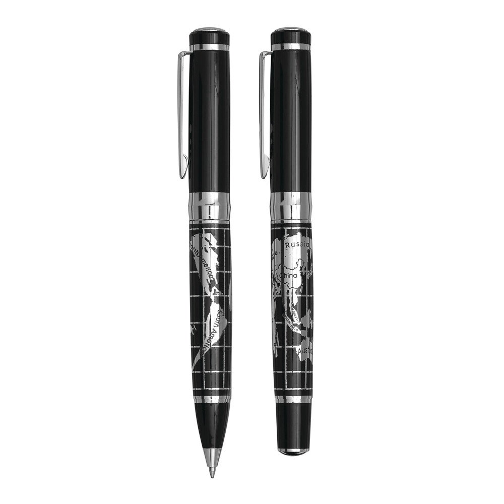 Schreibset INTERCONTINENTAL, 2-teilig: bestehend aus Kugelschreiber mit Drehmechanismus (blauschreibend) sowie Tintenroller mit Verschlusskappe mit Clip (schwarzschreibend), beide Schreibgeräte mit Metall-Schaft und chromglänzendem Weltkarten-Design, im Etui mit Aluminiumplatte