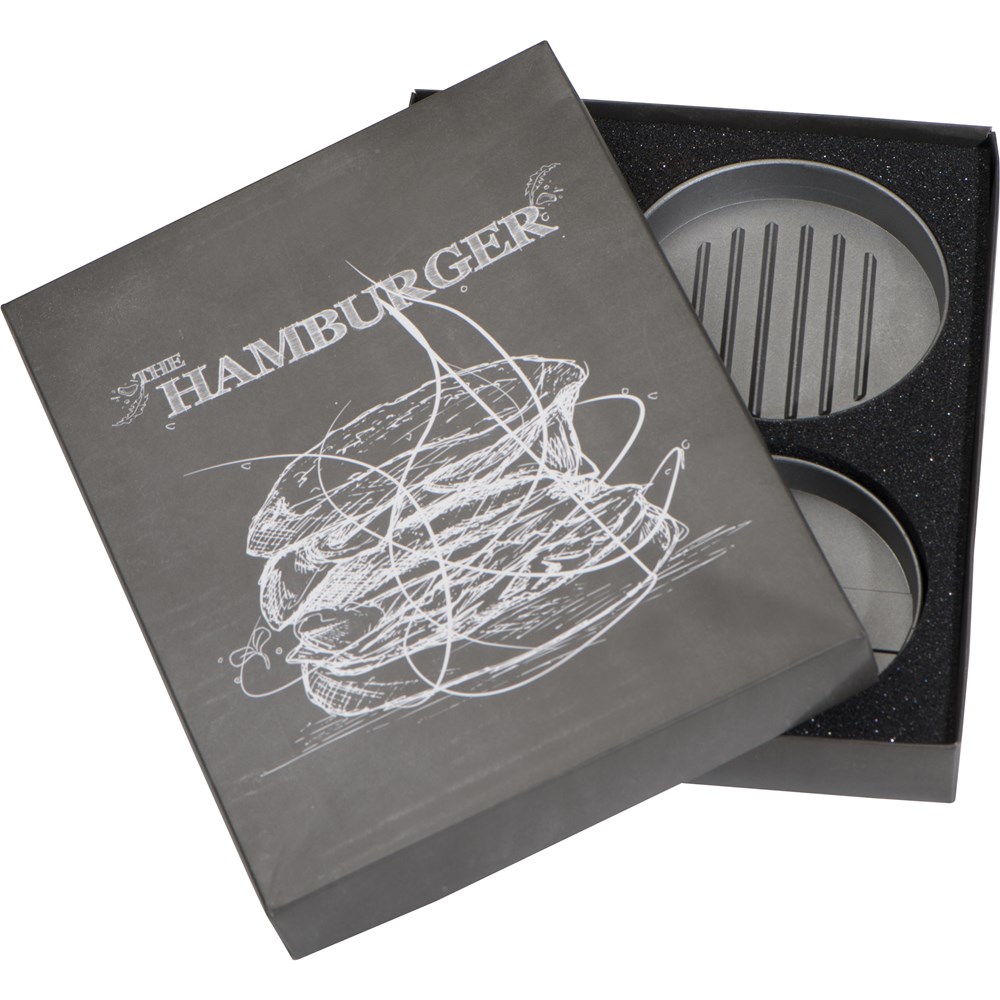 Burgerpresse in einer ansprechenden Verpackung bestehend aus einer Aluminium Pattypresse und einem Silikonpinsel. Durch einen Aufkleber (CMYK) auf dem Karton wird dieses Burgerset veredelt.