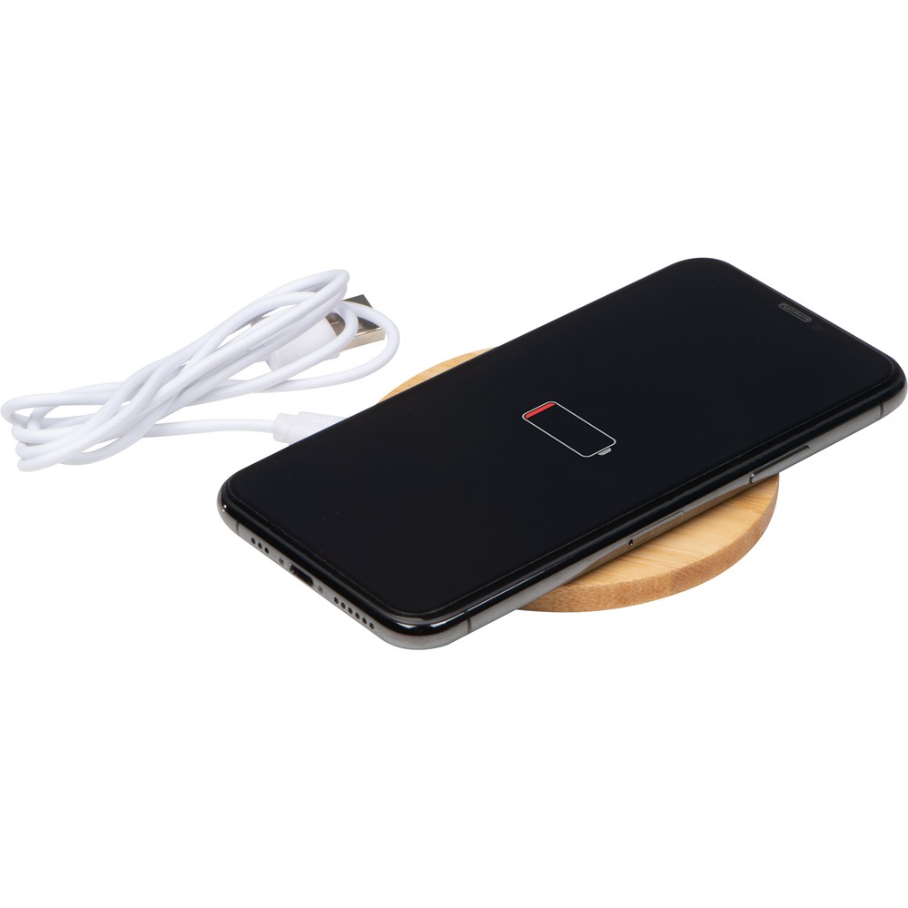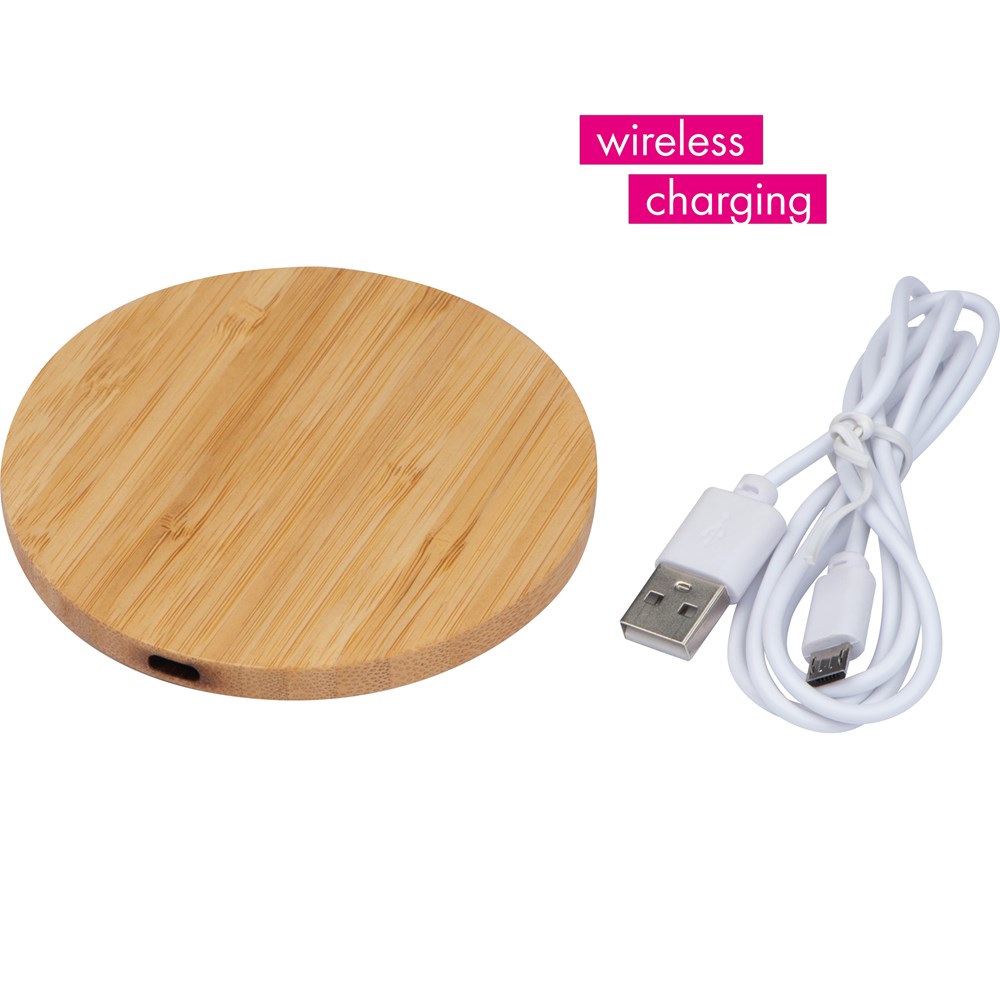 Runder Wireless Charger aus Bambus mit Ladekabel. Geeignet für alle QI-fähigen Smartphones. Ihre Werbung gravieren wir auf das Ladegerät.