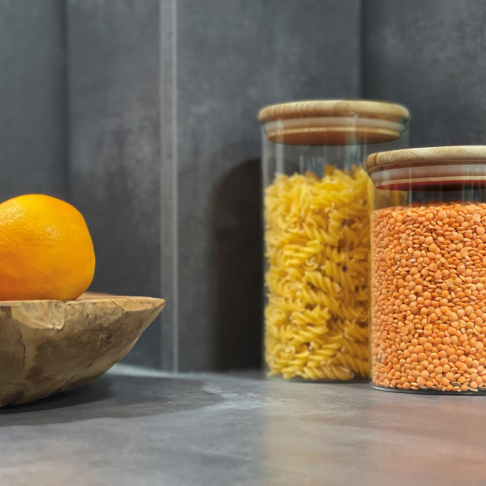 Vorratsdose aus Borosilikatglas mit Bambusdeckel und Silikonring. Mit einem Füllvermögen von 1.000 ml darf dieses Aufbewahrungsglas in keiner Küche fehlen. Ihre Werbung lasern wir auf den Bambusdeckel.