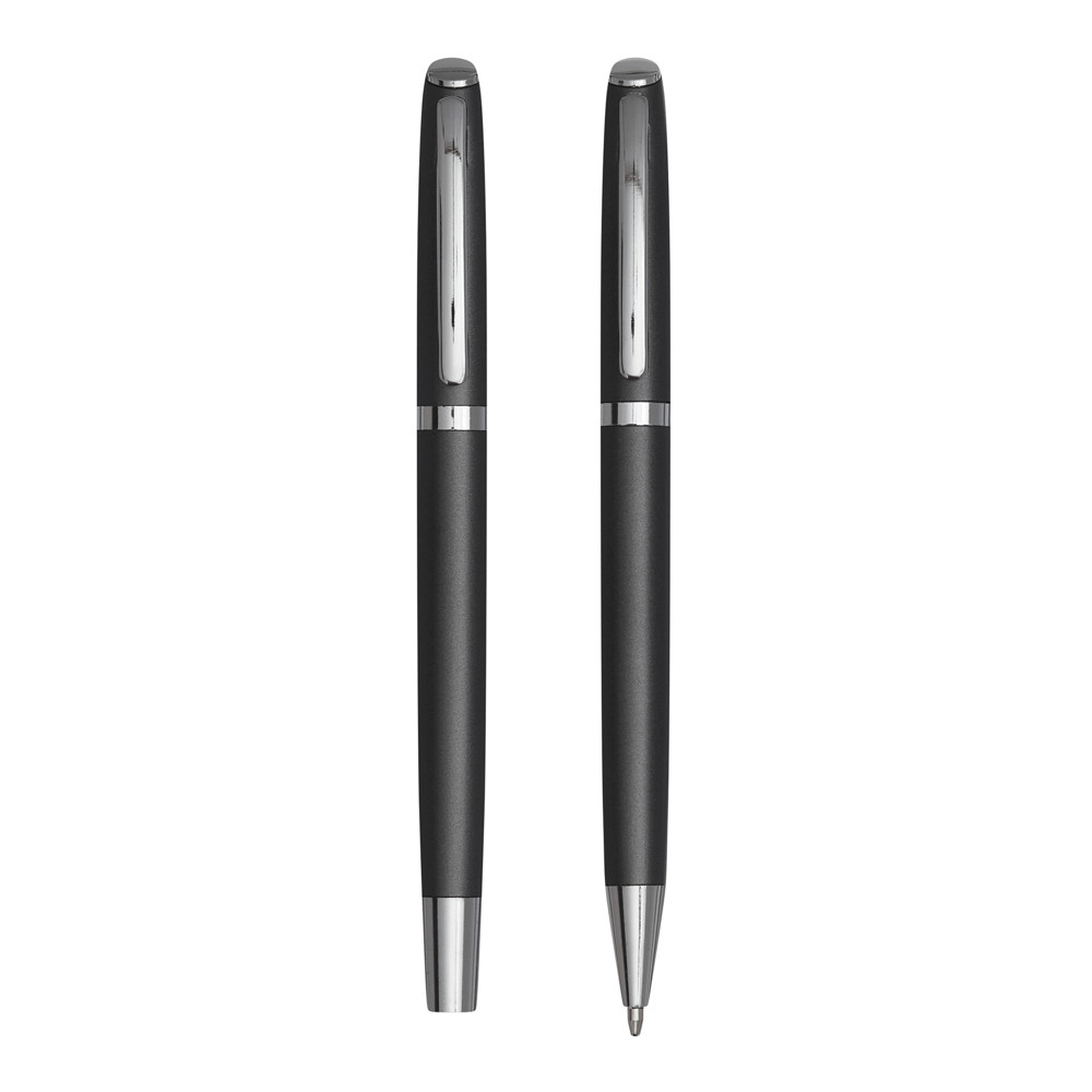 Schreibset ALPHABET, 2-teilig: bestehend aus Kugelschreiber mit Drehmechanismus (schwarzschreibend) sowie Tintenroller mit Verschlusskappe mit Clip (schwarzschreibend), beide Schreibgeräte mit Aluminium-Schaft, in Box