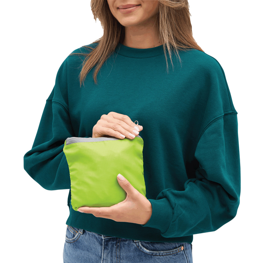 Sporttasche VOLUNTEER GYM, faltbar: Reißverschluss-Vorfach, Reißverschluss-Hauptfach mit 2 Reflektor-Etiketten, 2 seitliche Netzfächer, 2 lange Tragegriffe – lässt sich platzsparend zu einer Mini-Tasche zusammenfalten und passt perfekt in die Handtasche