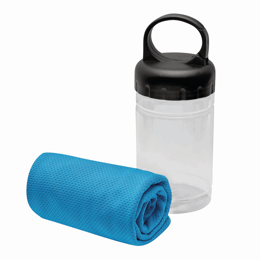 Kühlhandtuch CHILLING: in transparenter Dose, integrierter Sonnenschutzfaktor, für einen lang anhaltenden Kühleffekt Handtuch mit Wasser befeuchten und schleudern oder Wasser zur Dose hinzugeben und gut schütteln, Deckel mit Karabinerhaken (der Karabiner ist NICHT als Sicherung beim Klettern geeignet) - ideal für Fitness und Sportaktivitäten