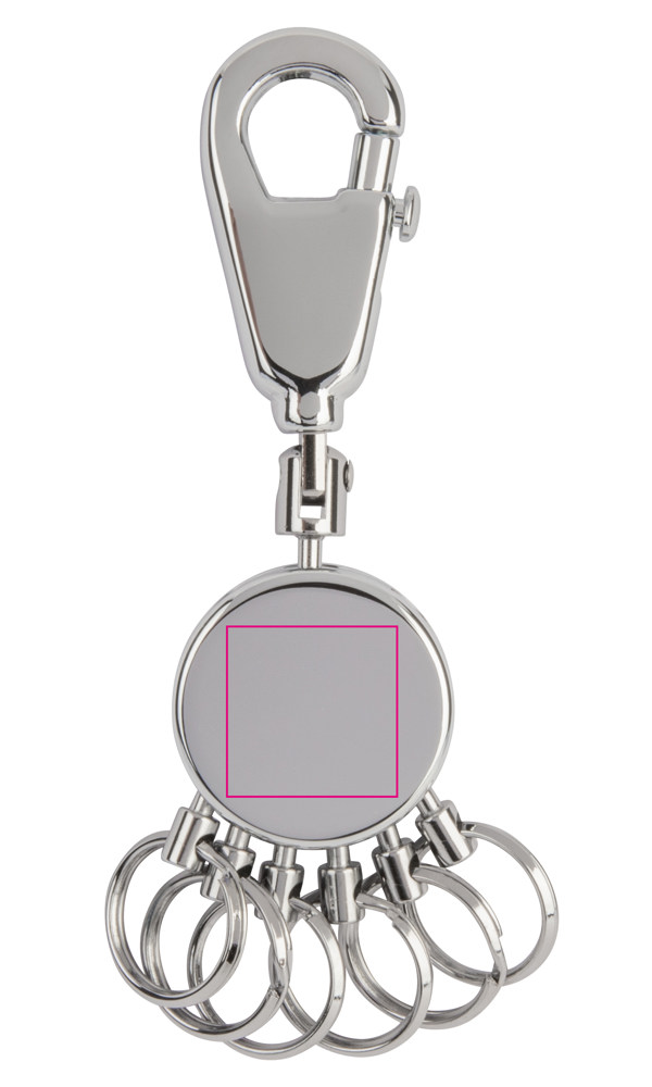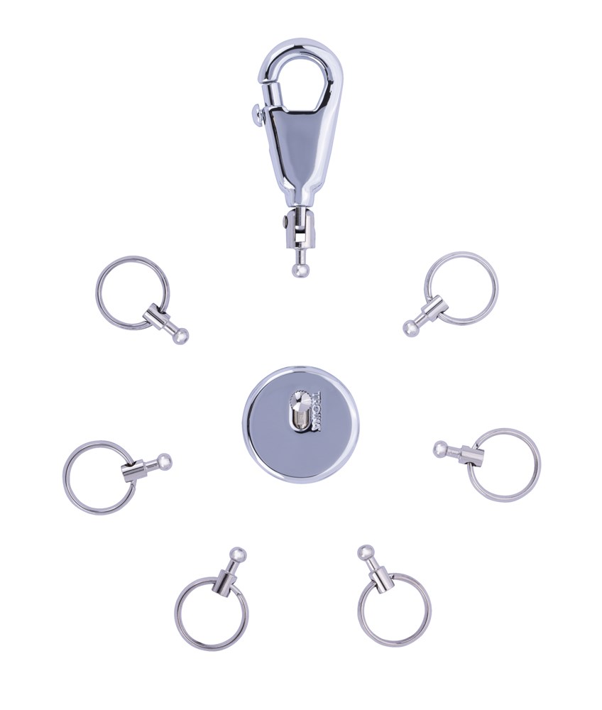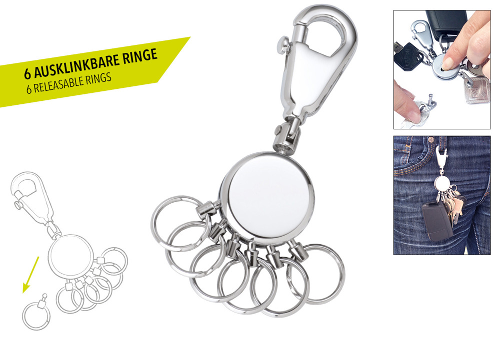 Schlüsselanhänger, rund, inkl. Karabinerhaken, 6 ausklinkbare Ringe, 6 austauschbare Ringe, Messing, Metall, verchromt, glänzend, silberfarben