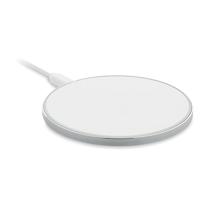 Induktive Ladestation 10W aus Aluminium mit Glas-Oberfläche. Verbinden Sie das Gerät mit Ihrem Computer, legen Sie das Smartphone darauf ab und laden Sie es auf. Blaue Ladeanzeige. Ausgang: DC 9V/1.1A.