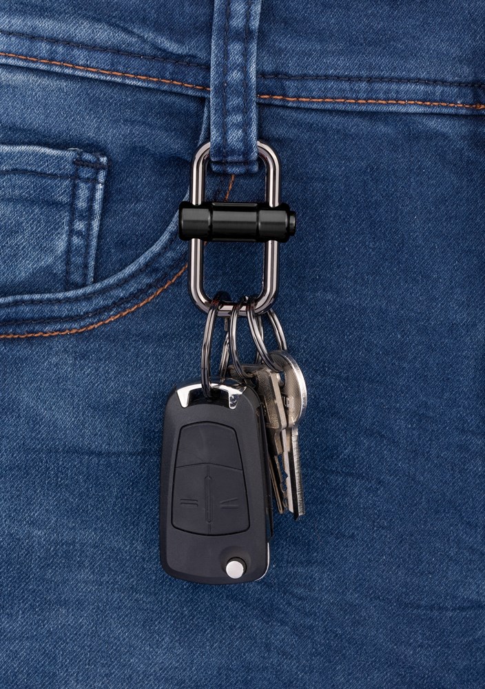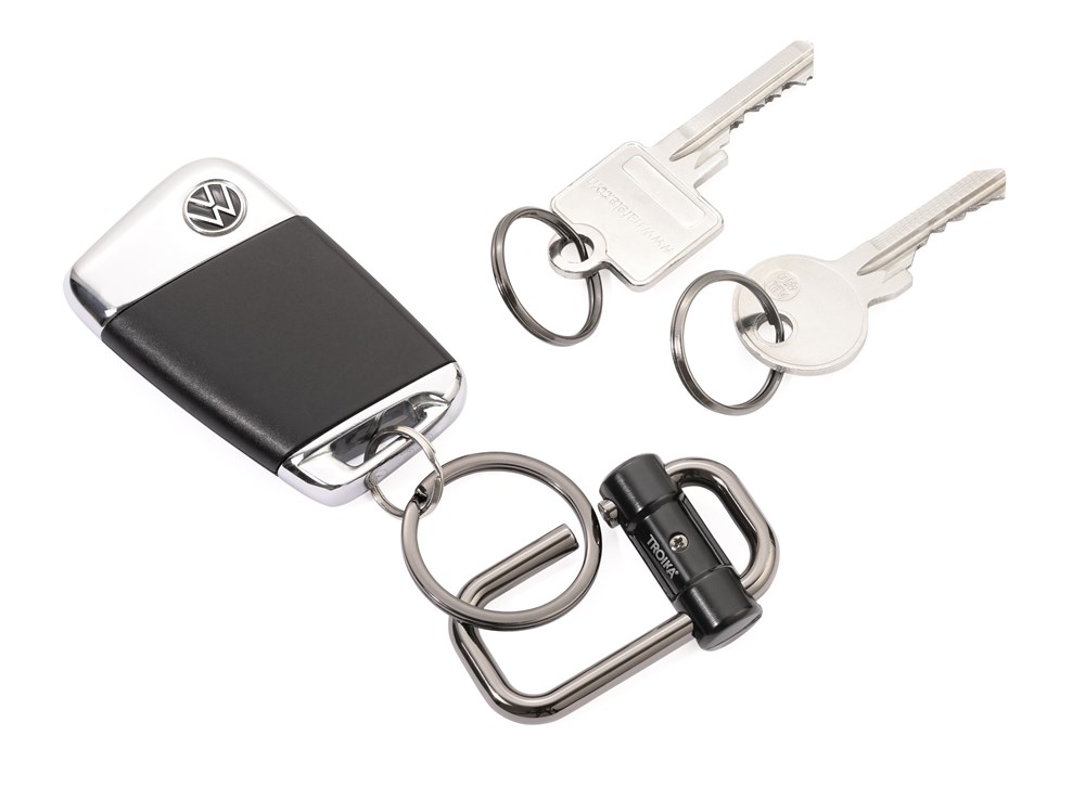 Schlüsselanhänger mit 3 Schlüsselringen in 2 Größen, Schiebeverschluss zur einfachen Schlüsselorganisation, Verschieben des Mittelteils zu beiden Seiten hin gibt Ringe frei, Metallguss, glänzend, gunmetal/schwarz
