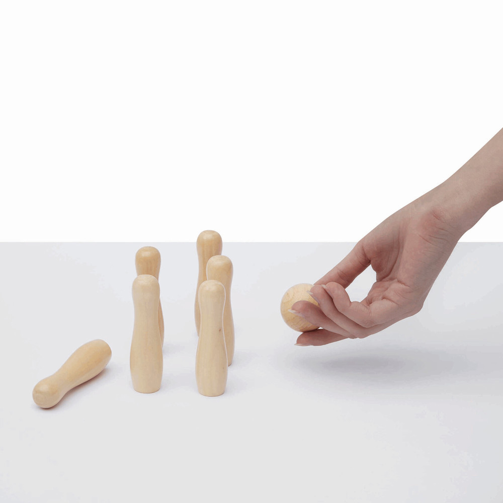 Bowling-Spiel FIRST STRIKE: 6 Holz-Kegel und eine Kugel, im umweltfreundlichen Baumwollbeutel mehr