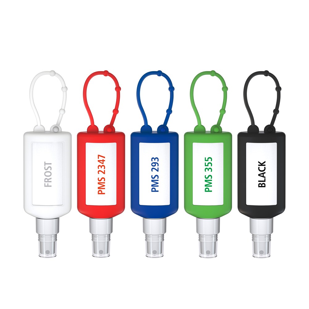 Praktische Kosmetikflasche zum Anhängen! Das Spray mit Silikonhülle ist nicht nur optisch ein echter Hingucker! Raffiniert mit Schlaufe zum Anhängen an de Strandtasche, den Wander-Rucksack, den Ski-Anorak oder an den Kinderwagen. 50 ml PET Flasche (weiß) mit weißem Pumpaufsatz und transparenter Schutzkappe; Silikonhülle und Schlaufe in schwarz. Nachfüllbar. Flasche hergestellt aus 100% recyceltem PET, weiß mit leichter R-PET-Färbung.