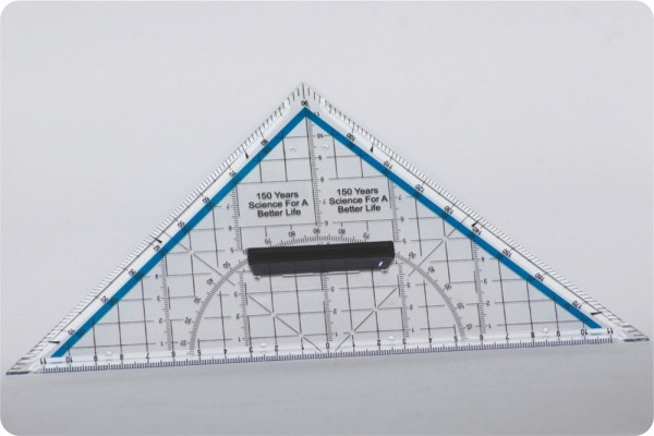 Geodreieck im Großformat (250 x 175mm) mit abnehmbaren Griff in schwarz, Skalierung in schwarz mit Farbstreifen gem. Pantone.Werbelogos werden individuell ins Skalierungssystem eingefügt.Sonderfarben (Pantone) für Farbstreifen ab 500 Stück.