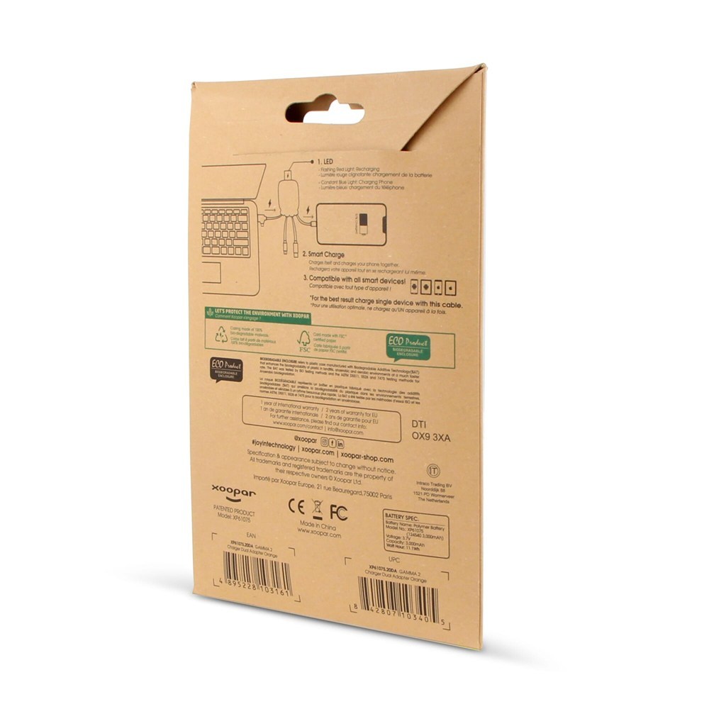 Eine Powerbank im Taschenformat, mit der Sie Ihr Smartphone aufladen können, wann immer Sie es brauchen. Das Xoopar Gamma 2 ist ein Multiladekabel mit dualem Eingangsanschluss USB-C / Lightning / Micro USB /USB, das aus recycelten Plastikflaschen (RPET) hergestellt wird und eine integrierte 3000mAh Powerbank hat.