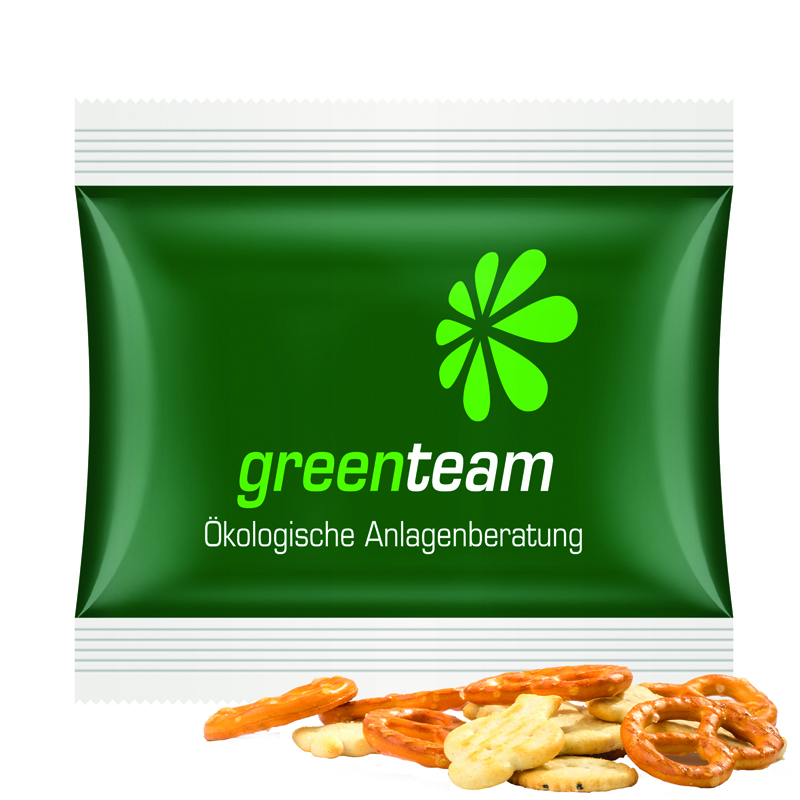 Snack Miditüte aus weißer Folie, kompostierbar, individuell bedruckt. Inhalt: Knabbermix, 10 g