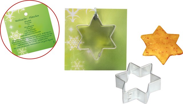 Ein minimalistisches und nachhaltiges Werbepräsent in der Adventszeit. Die Ausstechform ist immer wieder verwendbar. Das passende Rezept ist auf der Rückseite der Karte aufgedruckt. Die Karte im Standardmotiv lässt sich für Ihren Werbeeindruck nutzen, eine individuelle Gestaltung ist ebenfalls ab 250 Stück möglich.
