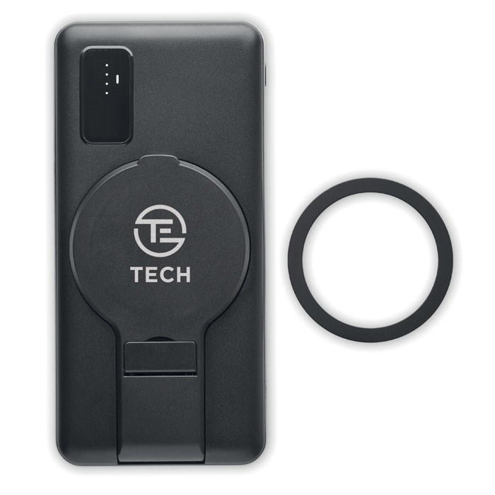 Induktives Ladegerät 15W mit Powerbank (10000 mAh). ABS. Magnetischer Smartphone Halter. Eingang: Mikro-B, Type-C. Ausgang 2x USB-A In/Output: Typ-C. Ausgang: DC 9V/1,66A (15W), ideal für Schnellladung. Inkl. magnetischen Metallring, um das Aufladen and