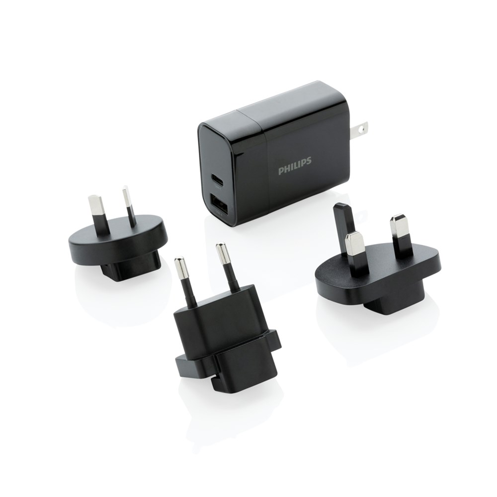 Philips ultraschnelles 30W-PD-Reiseladegerät kommt in praktischer Reisetasche und mit 4 Steckern; integrierter US-Stecker und wechselbare AU-, UK- und EU-Stecker. Input: 100-240V, 50-60Hz 0,7A; USB-A Output 5V/2,4A; Type-C 5V/3A, 9V/2A, 12V/1,5A. Verpackt in einer Philips Geschenkbox.