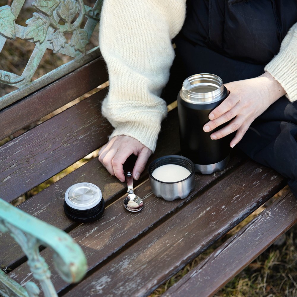 Kleine, handliche Thermosflasche mit dem gewissen Extra. Elegantes Design aus rostfreiem Stahl mit einem kleinen Klapplöffel im Deckel. Durch den großen Hals ist sie leicht zu reinigen und eignet sich perfekt zum Befüllen mit z. B. Suppe. Hält Ihre Speisen oder Getränke 24 Stunden lang eiskalt oder 12 Stunden lang heiß.