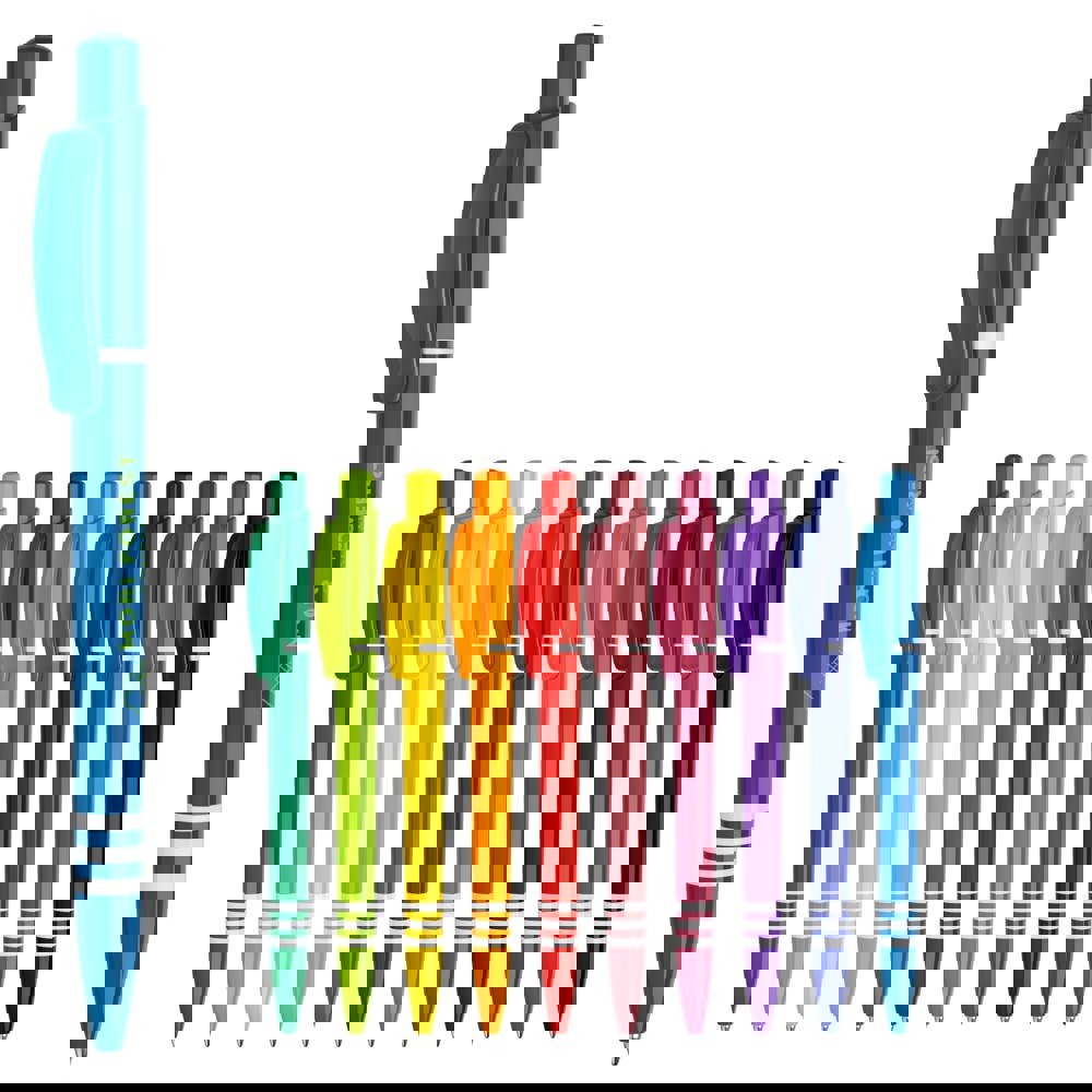 Der Hardcolour Kugelschreiber Tropic-Color hat eine große Druckfläche auf dem Clip und dem Schaft. Mit farbigem Schaft, Drücker und Clip. Der Schaft hat drei farbige Ringe in Weiß. Druckkugelschreiber ausgestattet mit einer blau schreibenden Jumbo-Refill-Mine. Der Stift besteht aus ABS-Kunststoff und wird in Europa hergestellt. Ab einer Abnahmemenge von 5.000 Stück sind eigene Farbkombinationen möglich.