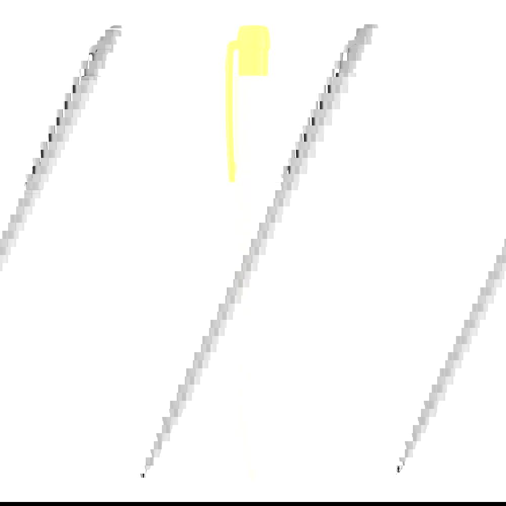 Schlanker weißer Hardcolour-Kugelschreiber mit farbigem Clip. Ein ansprechender Werbeartikel wegen seiner Druckfläche. Mit synthetischer blau schreibender X20-Refill-Mine. Druckkugelschreiber aus ABS, hergestellt in Europa. Ab einer Abnahmemenge von 5.000 Stück sind eigene Farbkombinationen möglich.