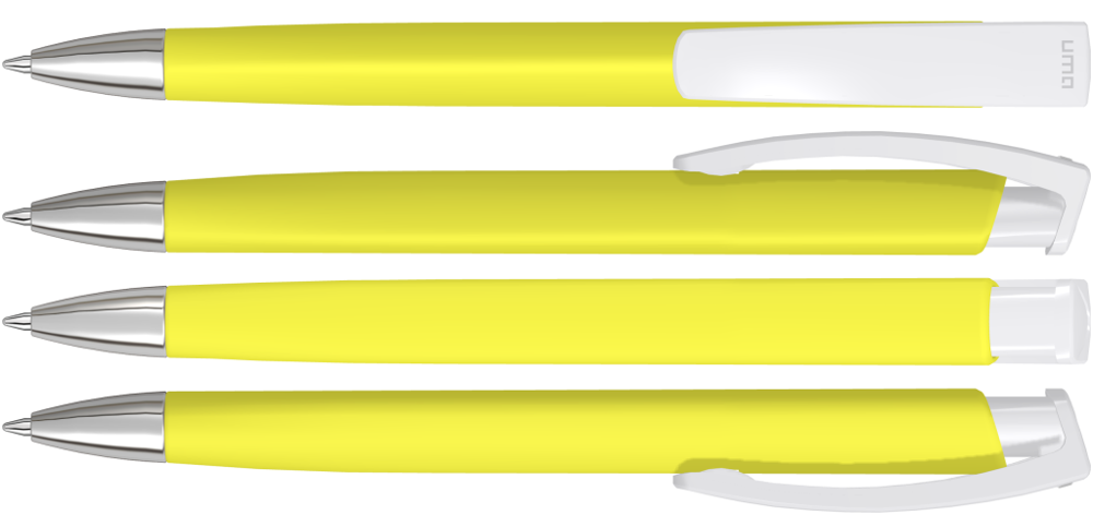 Druckkugelschreiber mit gummiertem Dreikantgehäuse, weiß gedeckt glänzendem Clip und schwerer Metallspitze glanzverchromt.
