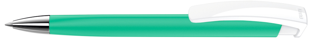 Druckkugelschreiber mit gummiertem Dreikantgehäuse, weiß gedeckt glänzendem Clip und schwerer... mehr