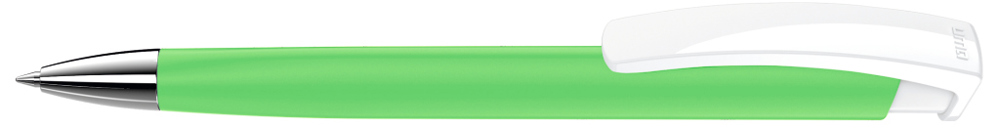 Druckkugelschreiber mit gummiertem Dreikantgehäuse, weiß gedeckt glänzendem Clip und schwerer Metallspitze glanzverchromt.