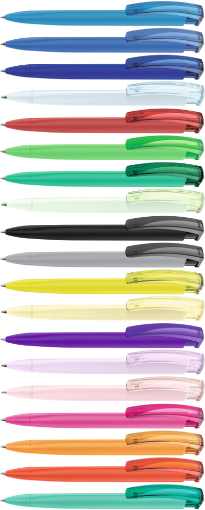 Druckkugelschreiber mit gummiertem Dreikantgehäuse und transparent glänzendem Clip. mehr