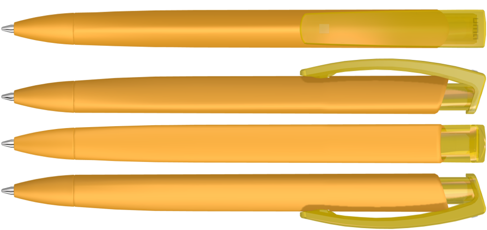 Druckkugelschreiber mit gummiertem Dreikantgehäuse und transparent glänzendem Clip. mehr