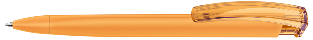 Druckkugelschreiber mit gummiertem Dreikantgehäuse und transparent glänzendem Clip.