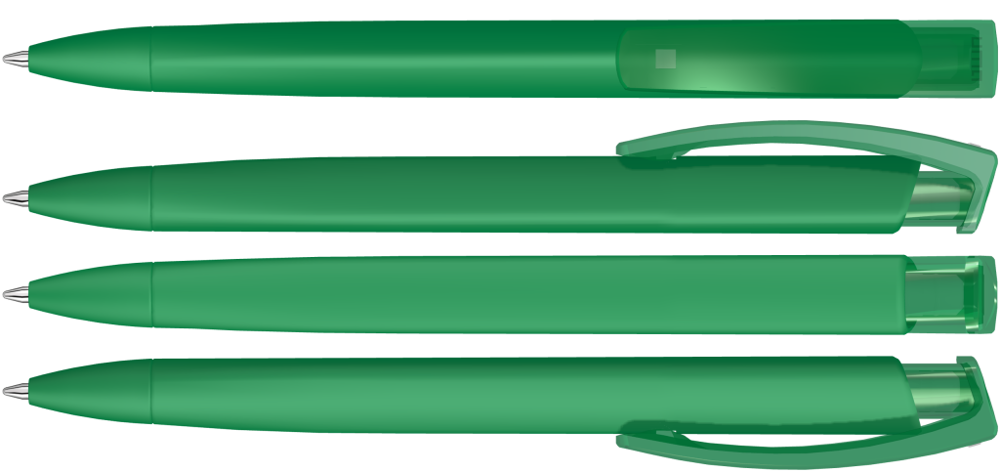 Druckkugelschreiber mit gummiertem Dreikantgehäuse und transparent glänzendem Clip.