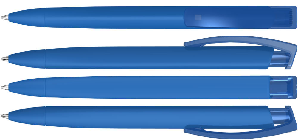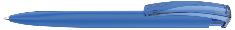 Druckkugelschreiber mit gummiertem Dreikantgehäuse und transparent glänzendem Clip.