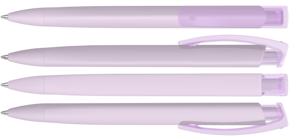 Druckkugelschreiber mit gummiertem Dreikantgehäuse und transparent glänzendem Clip. mehr