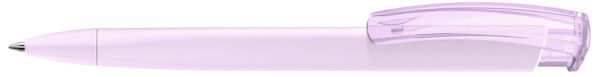Druckkugelschreiber mit gummiertem Dreikantgehäuse und transparent glänzendem Clip.