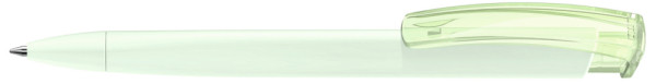 Druckkugelschreiber mit gummiertem Dreikantgehäuse und transparent glänzendem Clip.