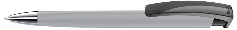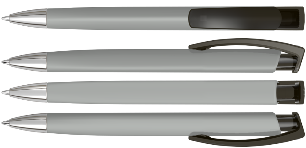 Druckkugelschreiber mit gummiertem Dreikantgehäuse, transparent glänzendem Clip und schwerer Metallspitze glanzverchromt.