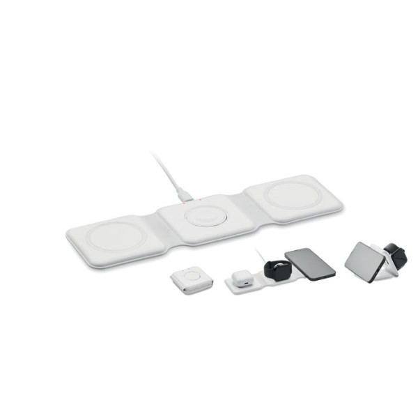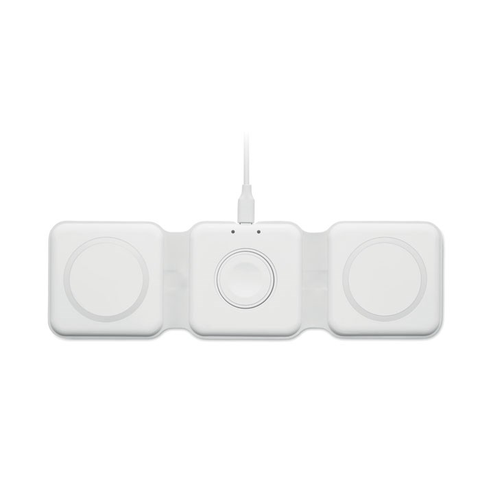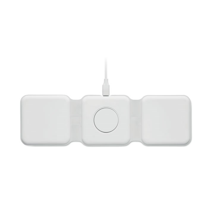 Zusammenfaltbare Ladestation 3in1. ABS. Sie verfügt über 3 kabellose Ladepunkte. Eingang: 2-in-1 Typ-C und Typ-A. 15 W. Auch kompatibel mit der iWatch.