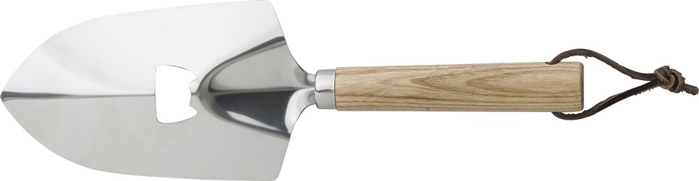 Gartenschaufel aus rostfreiem Stahl mit Holzgriff und PU-Band. Flaschenöffner im Inneren der Schaufel. Einzeln verpackt in einer braunen Papierschachtel.