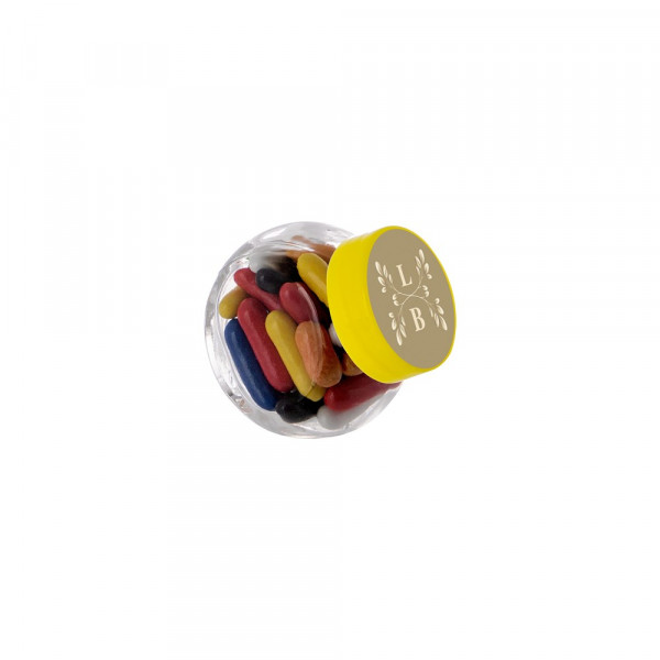 Mikro Glas 50 ml mit gelbem Deckel gefüllt mit Lakritzstangen mix und einem 4c-Euroskala Aufkleber auf Deckel