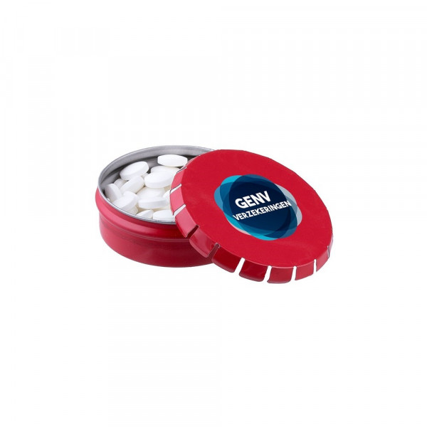 Mini Klick-Klack Dose rot mit ca. 23 Gramm Pfefferminz, 4c-Euroskala, inkl. Zutatenaufkleber und eingeschweißt