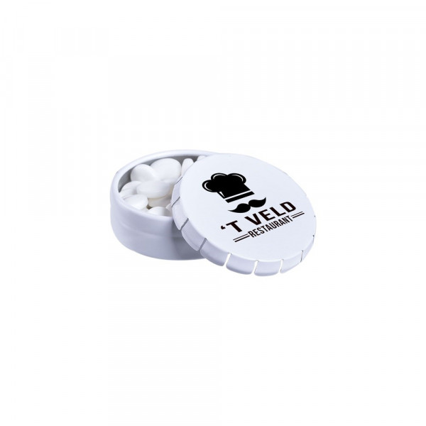 Super Mini Klick-Klack Dose weiß mit ca. 12 Gramm Pfefferminz, 4c-Euroskala, inkl. Zutatenaufkleber und eingeschweißt