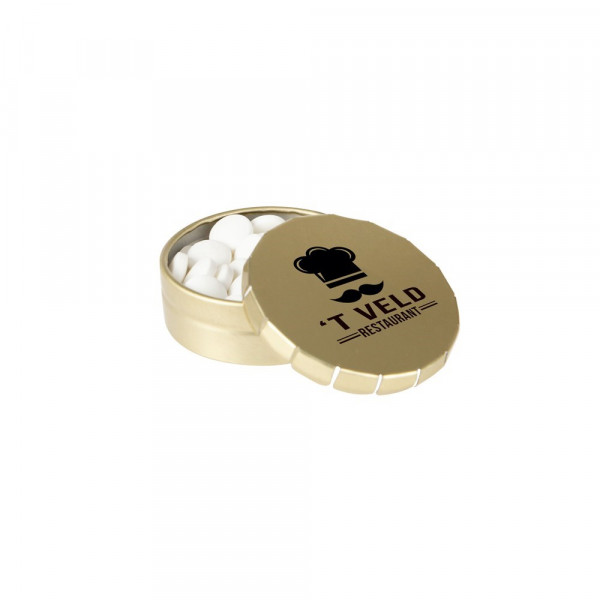 Super Mini Klick-Klack Dose gold mit ca. 12 Gramm Pfefferminz, 4c-Euroskala, inkl. Zutatenaufkleber und eingeschweißt