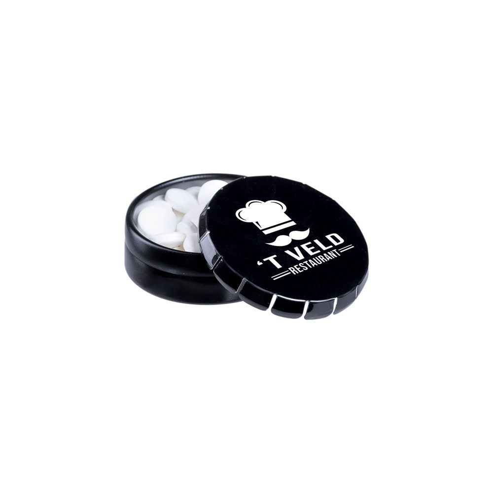 Super Mini Klick-Klack Dose schwarz mit ca. 12 Gramm Pfefferminz, 4c-Euroskala, inkl. Zutatenaufkleber und eingeschweißt