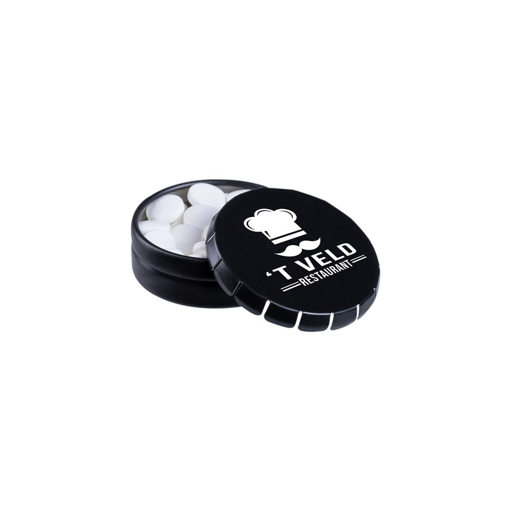 Super Mini Klick-Klack Dose mattschwarz mit ca. 12 Gramm Pfefferminz, 4c-Euroskala, inkl. Zutatenaufkleber und eingeschweißt