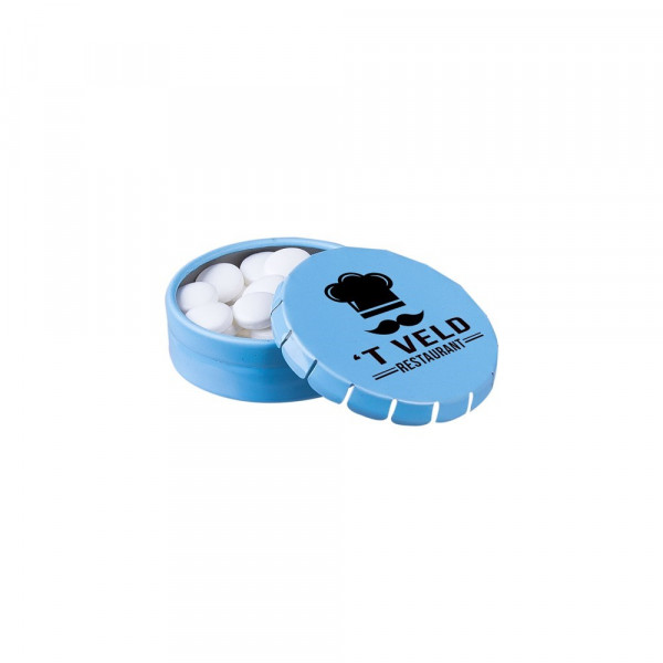 Super Mini Klick-Klack Dose hellblau mit ca. 12 Gramm Pfefferminz, 4c-Euroskala, inkl. Zutatenaufkleber und eingeschweißt