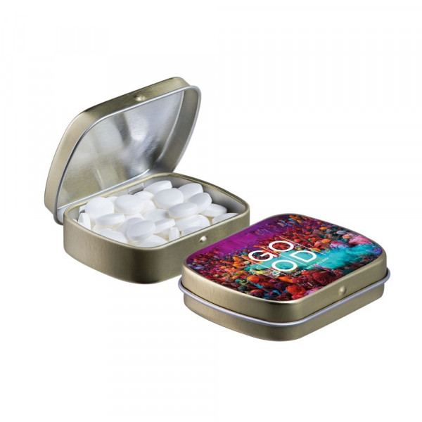 Mini Klappdeckeldose gold mit ca. 23 Gramm Pfefferminz, 4c-Euroskala, inkl. Zutatenaufkleber und eingeschweißt