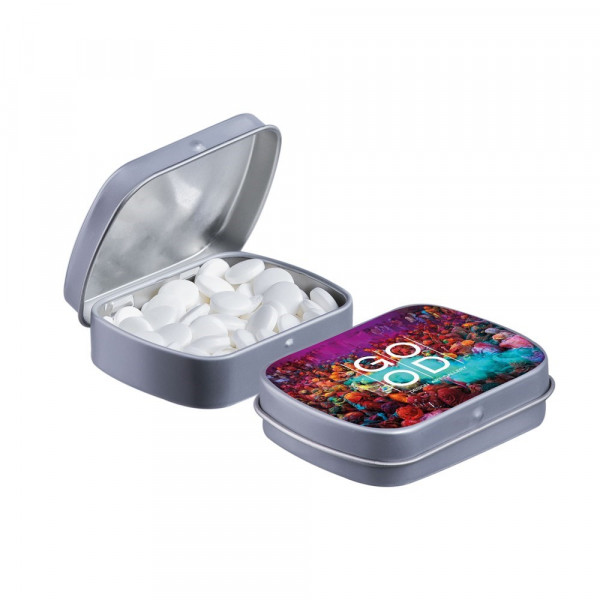 Mini Klappdeckeldose grau mit ca. 23 Gramm Pfefferminz, 4c-Euroskala, inkl. Zutatenaufkleber und eingeschweißt