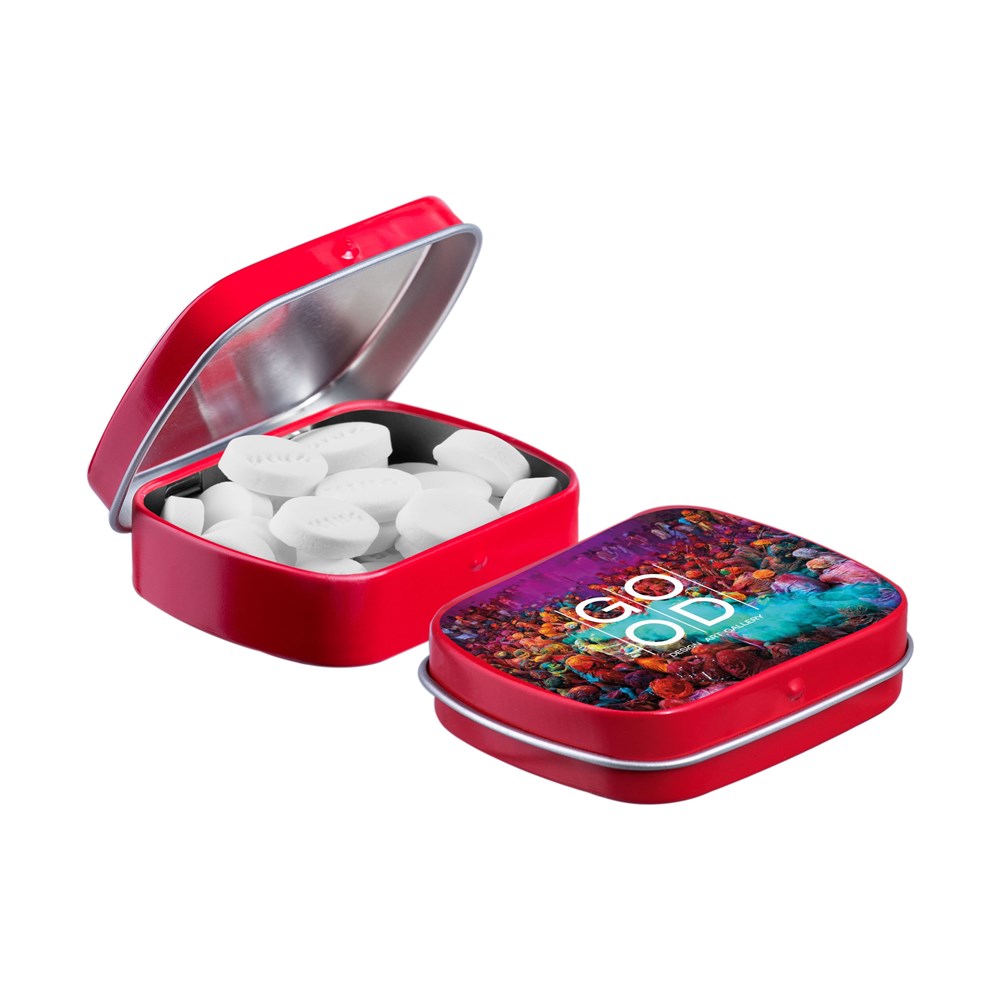 Mini-Scharnierdose weiß mit ca. 23 Gramm King Mini Peppermint und mit einem Vollfarbdruck versehen. Inklusive Inhaltsstoffaufkleber und Siegel.