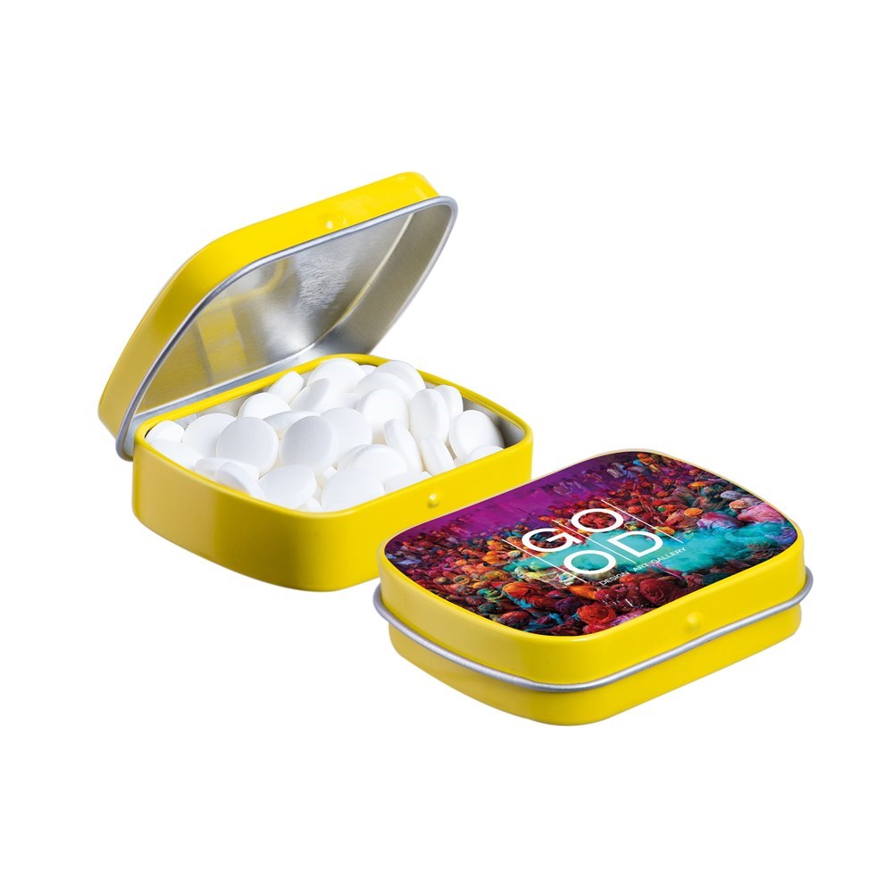 Mini Klappdeckeldose gelb mit ca. 23 Gramm Pfefferminz, 4c-Euroskala, inkl. Zutatenaufkleber und eingeschweißt