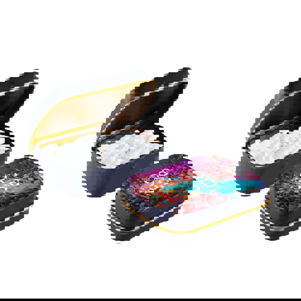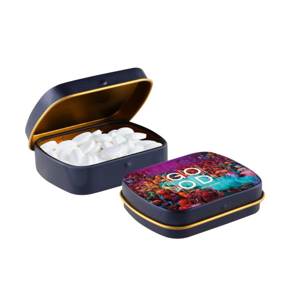 Mini Klappdeckeldose in matt dunkelblau mit goldener Innenseite und ca. 23 Gramm Pfefferminz. Mit Vollfarbdruck, Inhaltsstoffaufkleber und Siegel.