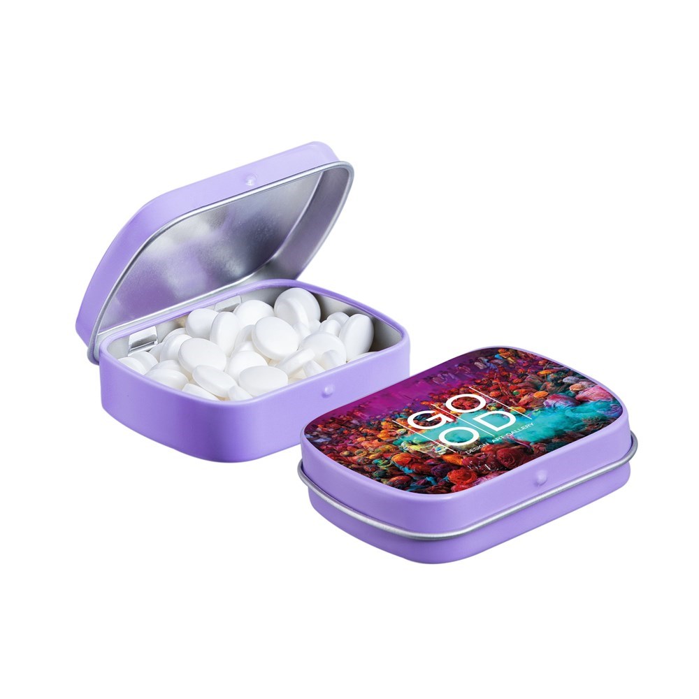 Mini Klappdeckeldose lila mit cca. 23 Gramm Pfefferminz, 4c-Euroskala, inkl. Zutatenaufkleber und eingeschweißt