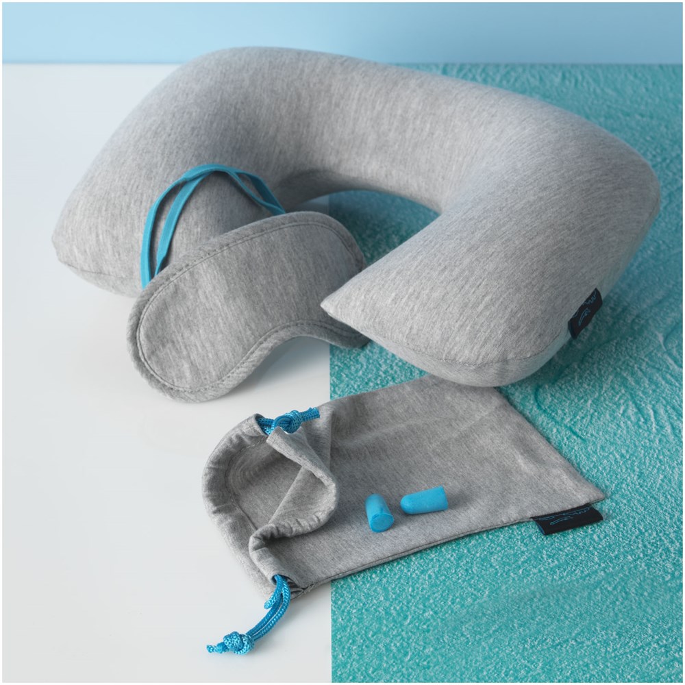 Soft Reiseset enthält ein aufblasbares Nackenkissen mit hellblauem Reißverschluss, Augenmaske mit hellblauem Gummi, hellblaue Ohrstöpsel und eine Softhülle mit hellblauem Kordelzugverschluss. (Zubehör nicht in Softhülle gepackt).